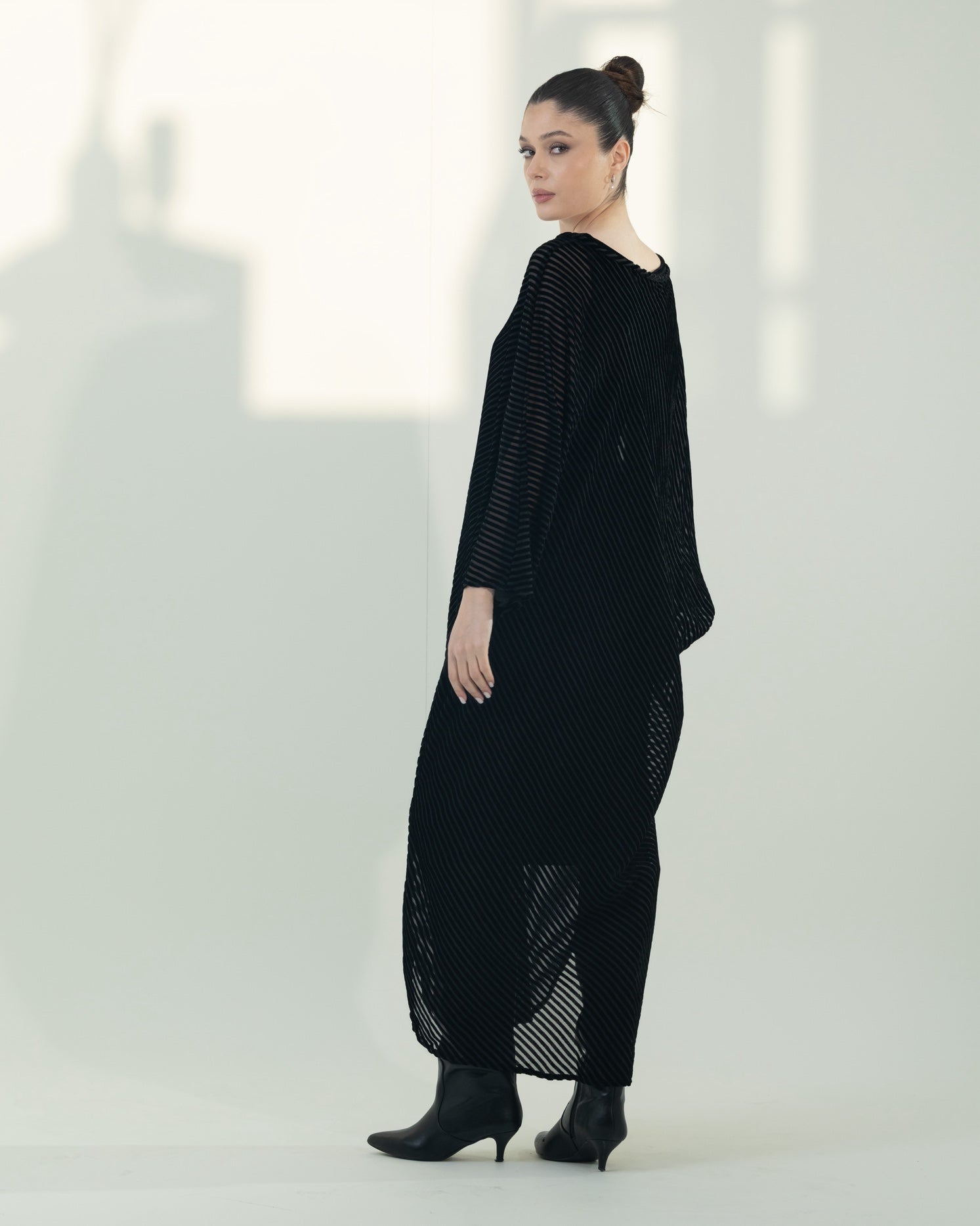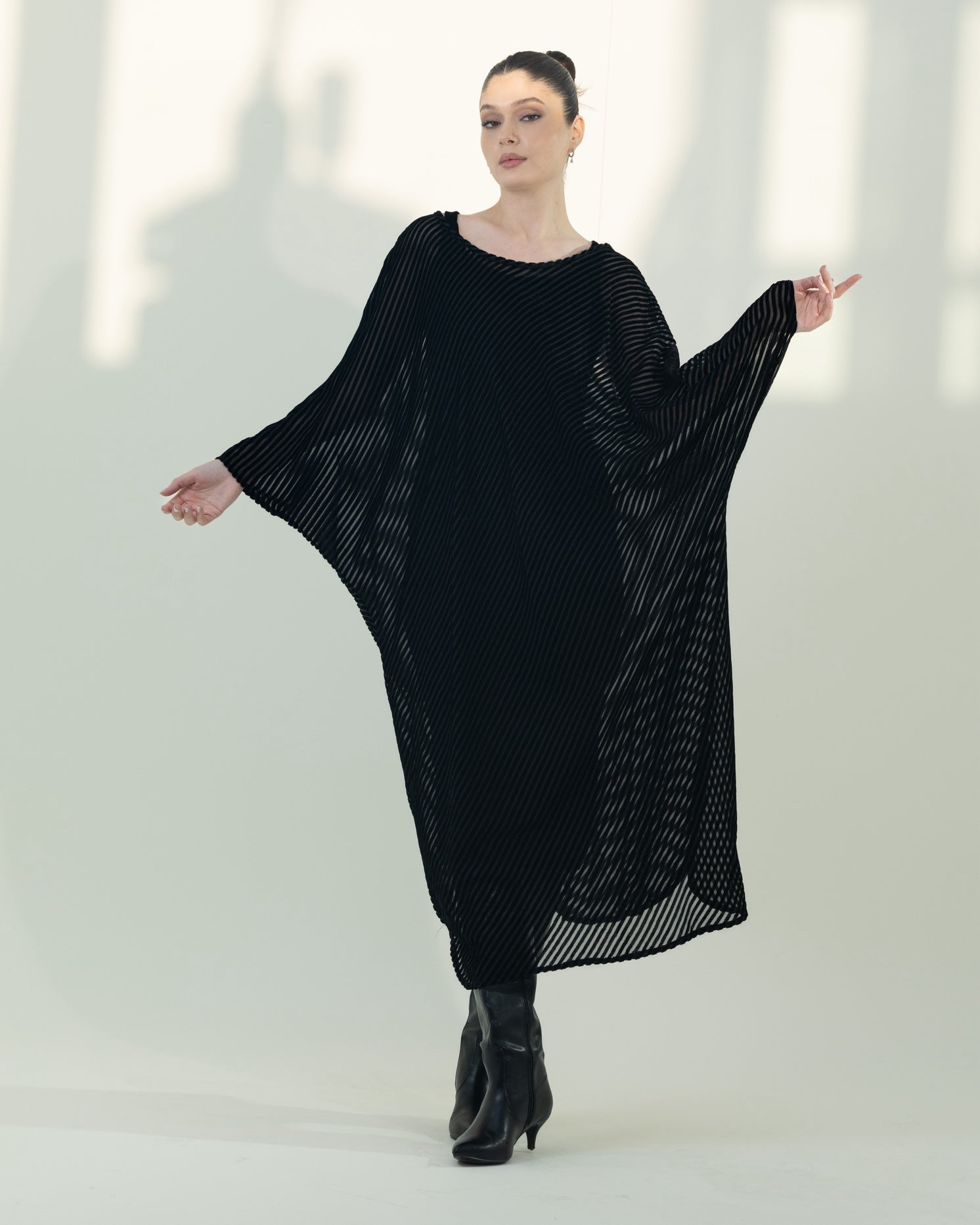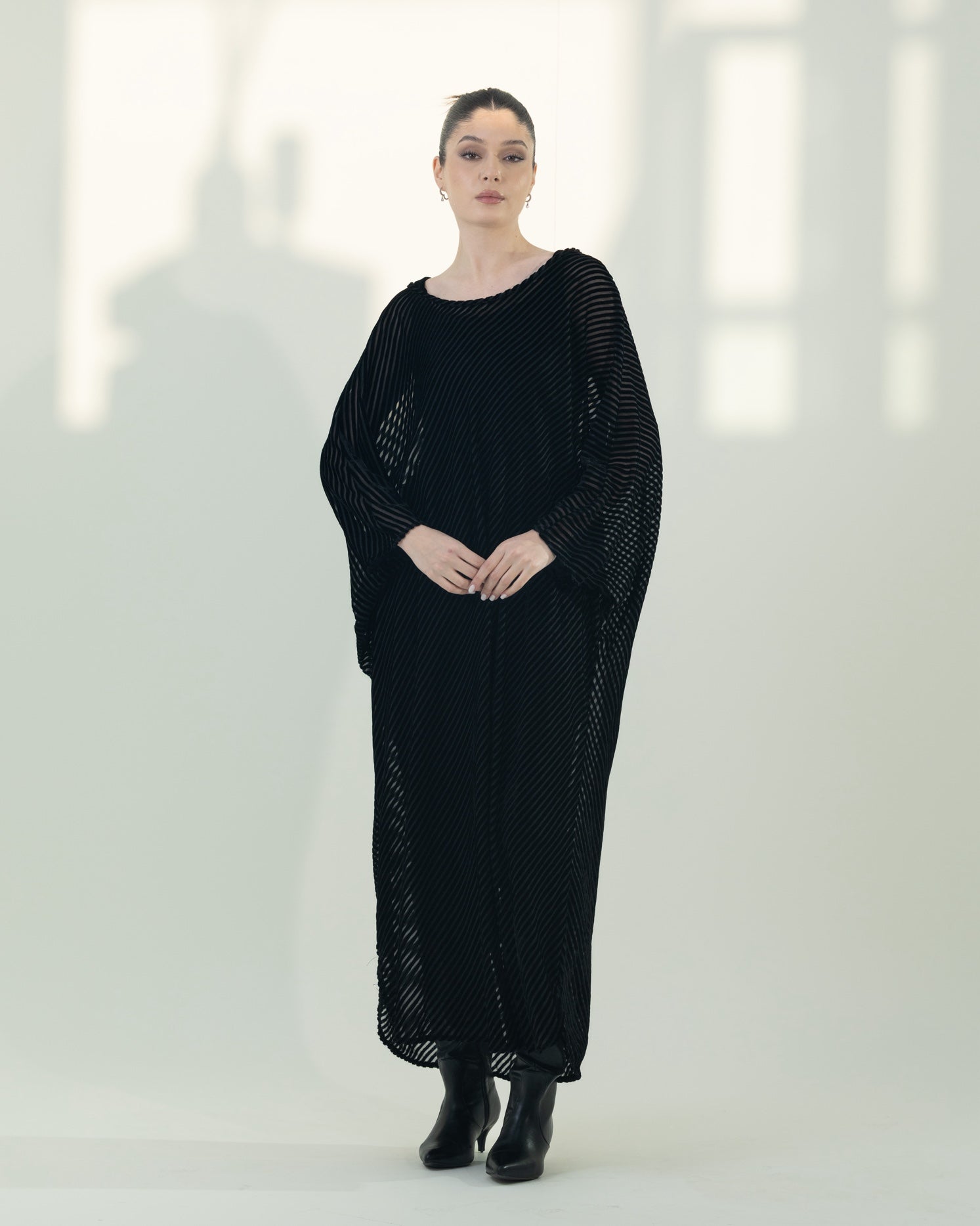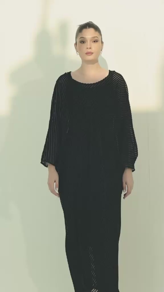 This elegant kaftan features a beautifully layered two-piece design. The inner dress is crafted from soft, stretchy velvet for a comfortable and flattering fit, while the outer layer is made from flowy, lined velvet that drapes effortlessly. Designed in a free-size silhouette with adjustable detailing, it offers both versatility and ease of wear. The inner dress measures 52 inches in length, with the outer kaftan extending to 54 inches, creating a graceful, elongated look perfect for any occasion.