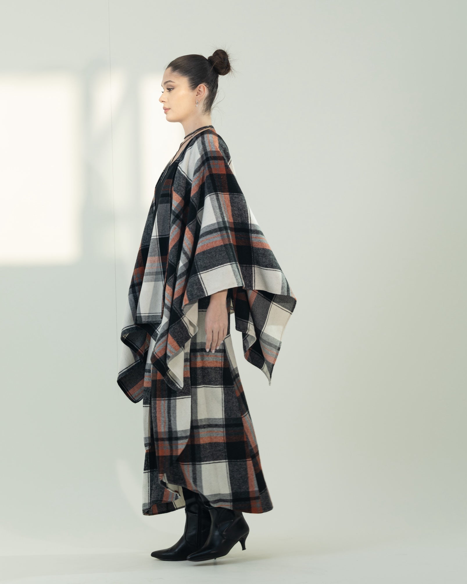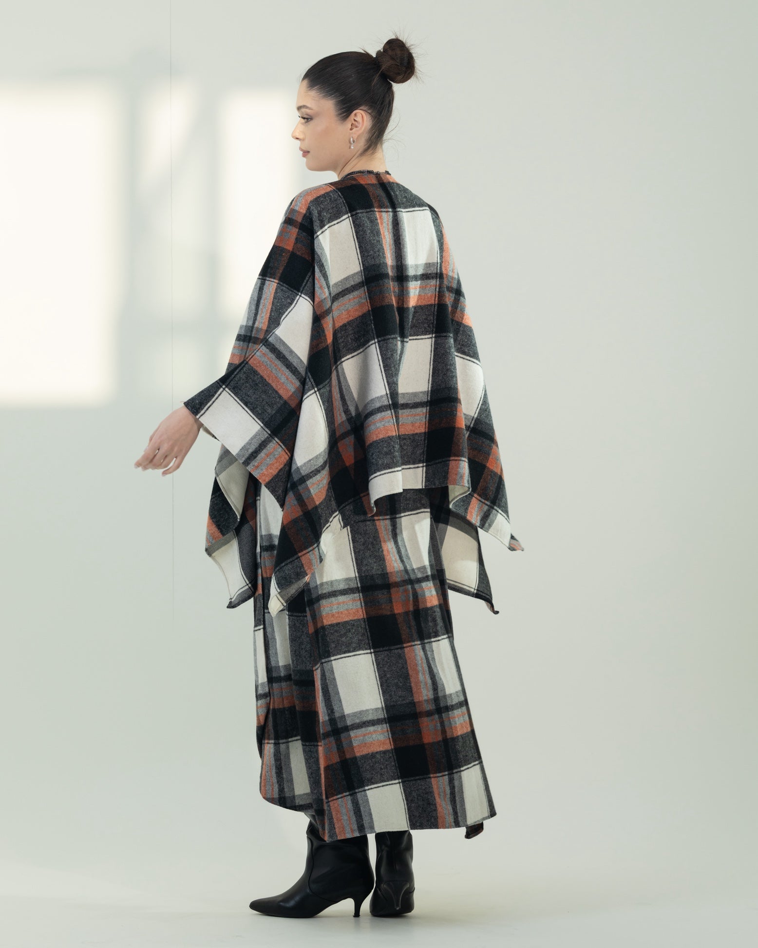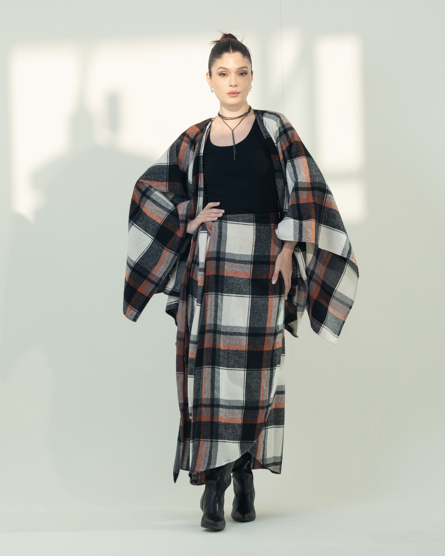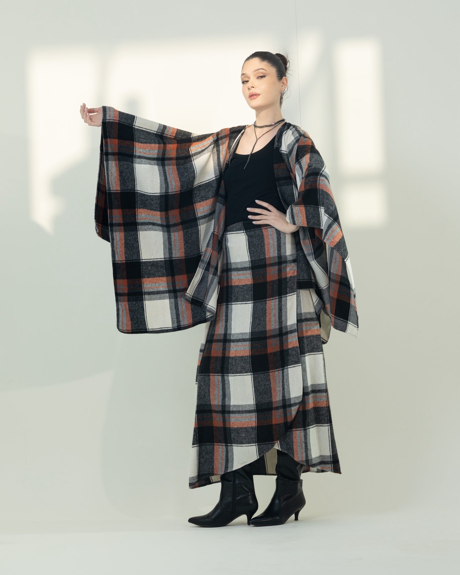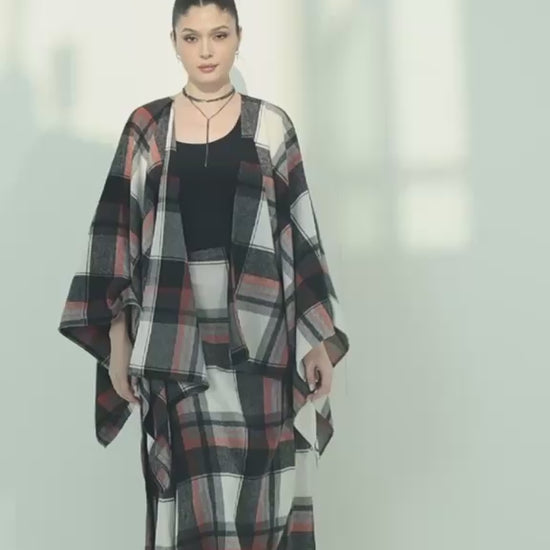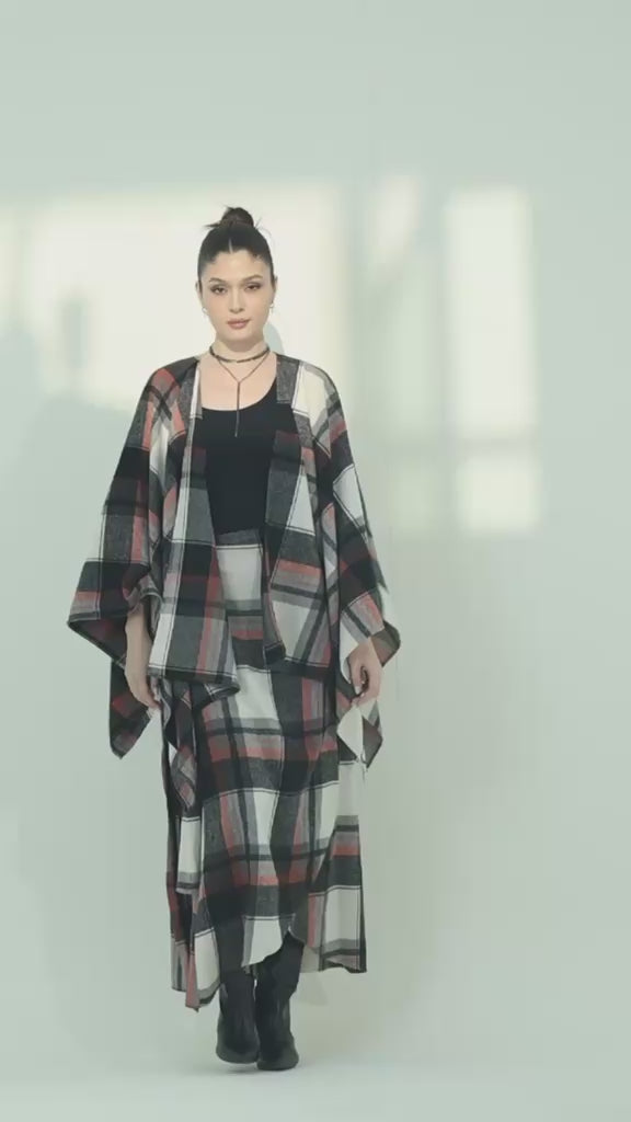 Two-piece free-size set featuring a wrap skirt and a kimono-style top. Made from soft, warm fabric with a classic checkered pattern, offering both comfort and effortless style.