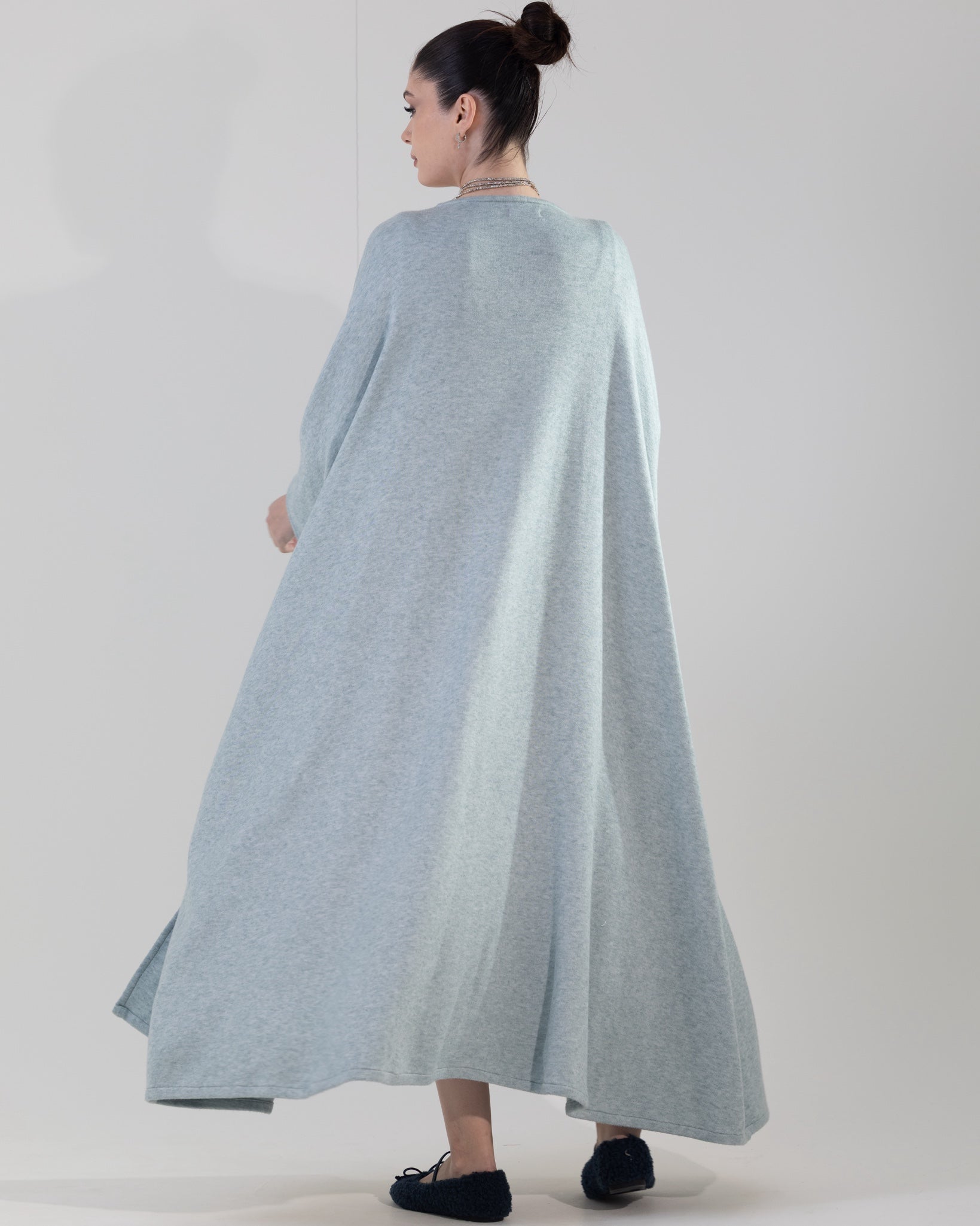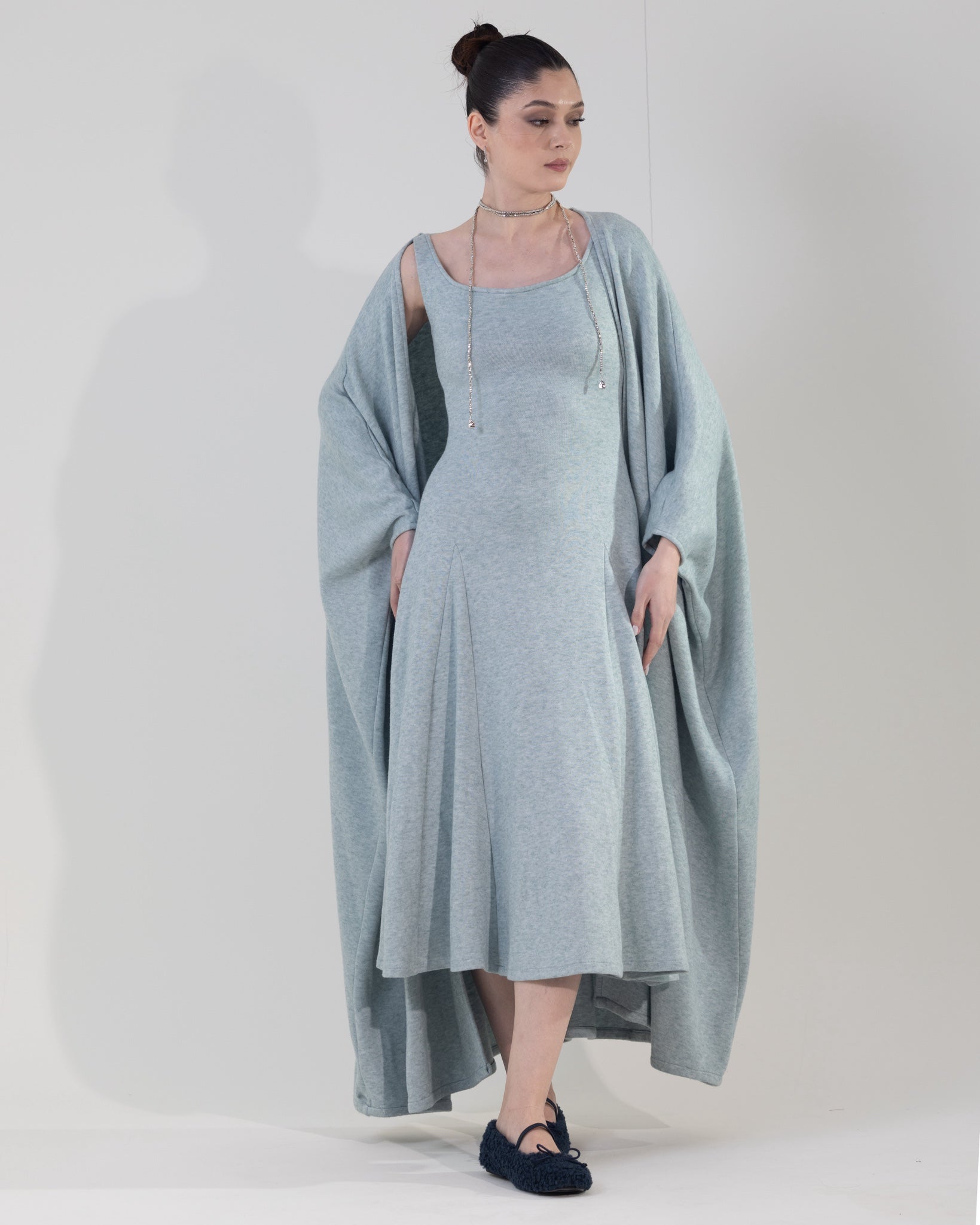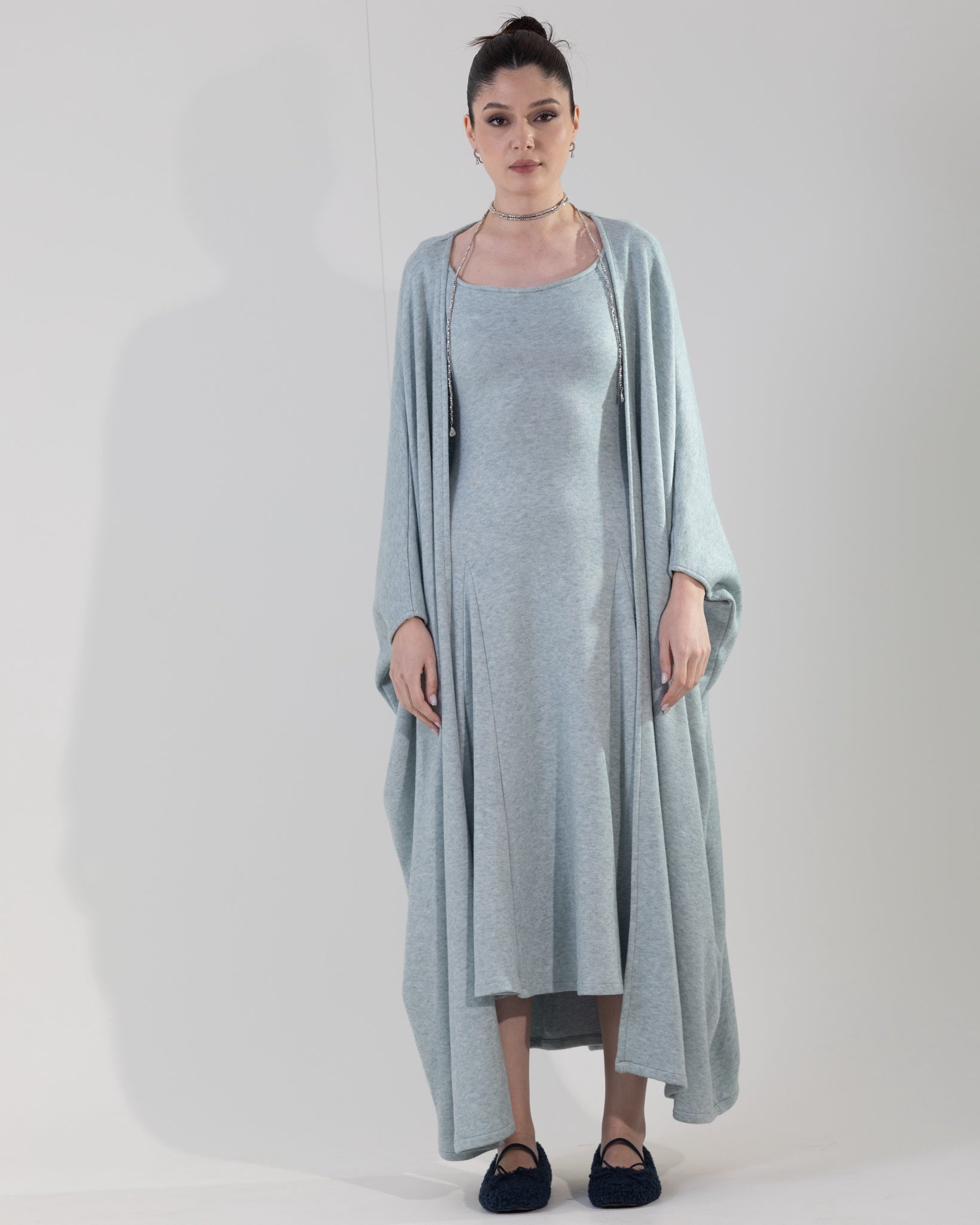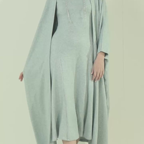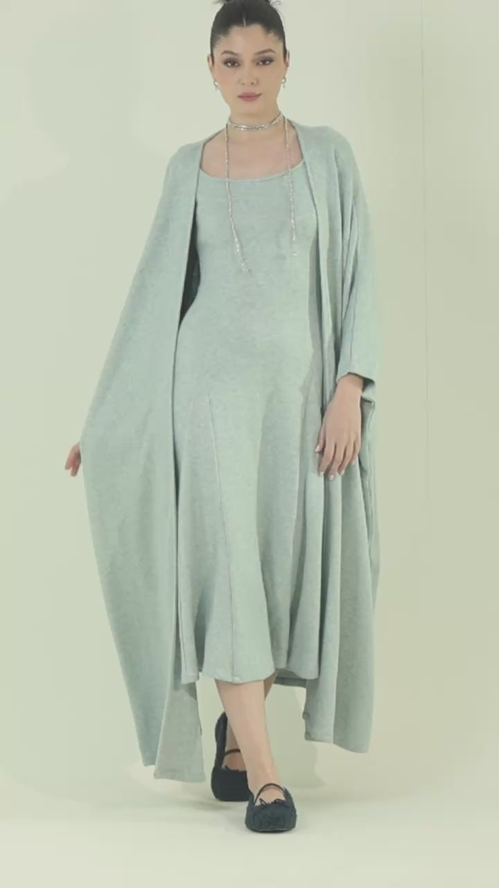 Two-piece knit set featuring a chunky bisht layered over a fitted A-line dress. The dress is designed with subtle shaping details to flatter and define the body, while the relaxed bisht adds warmth and an effortless, modern look.