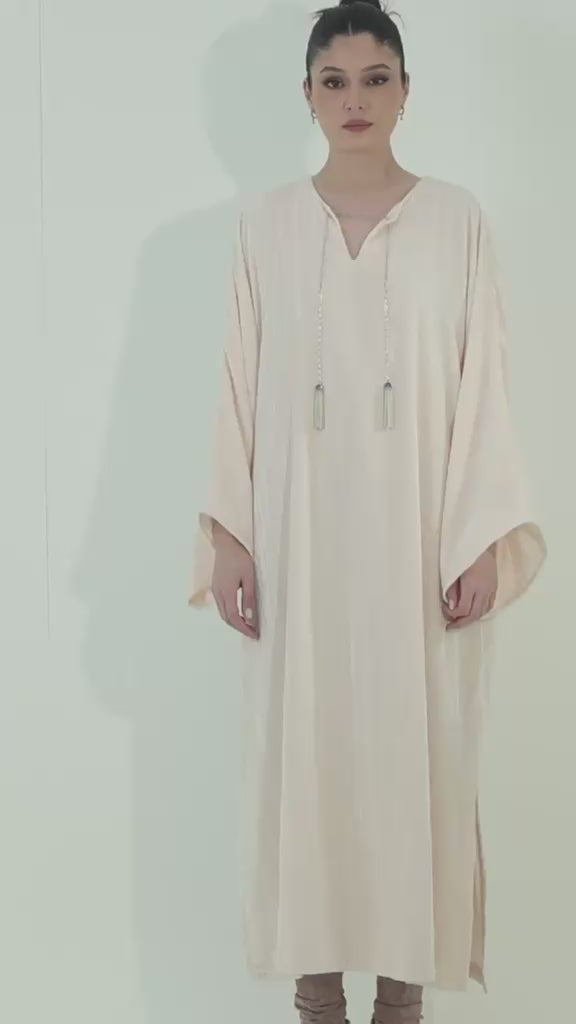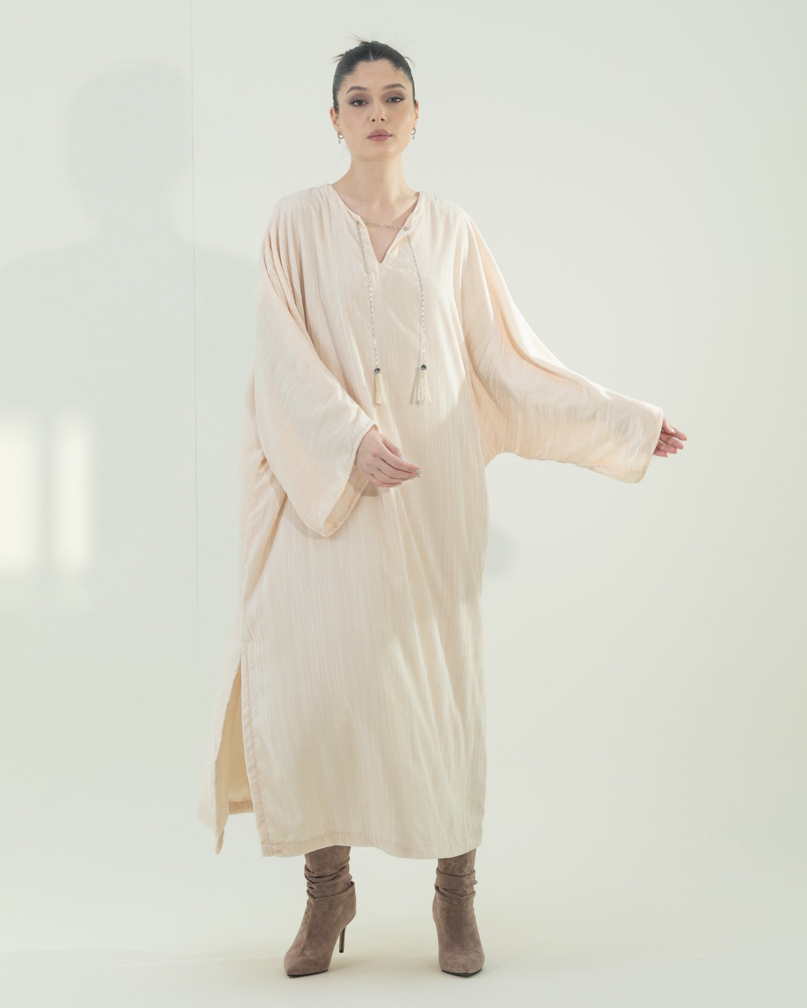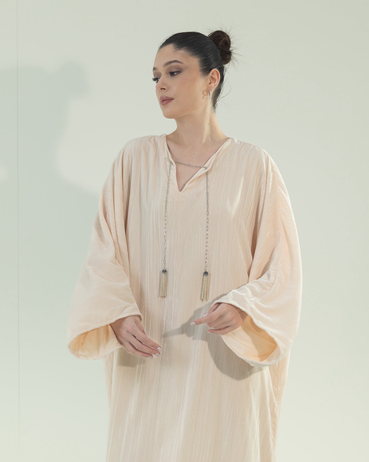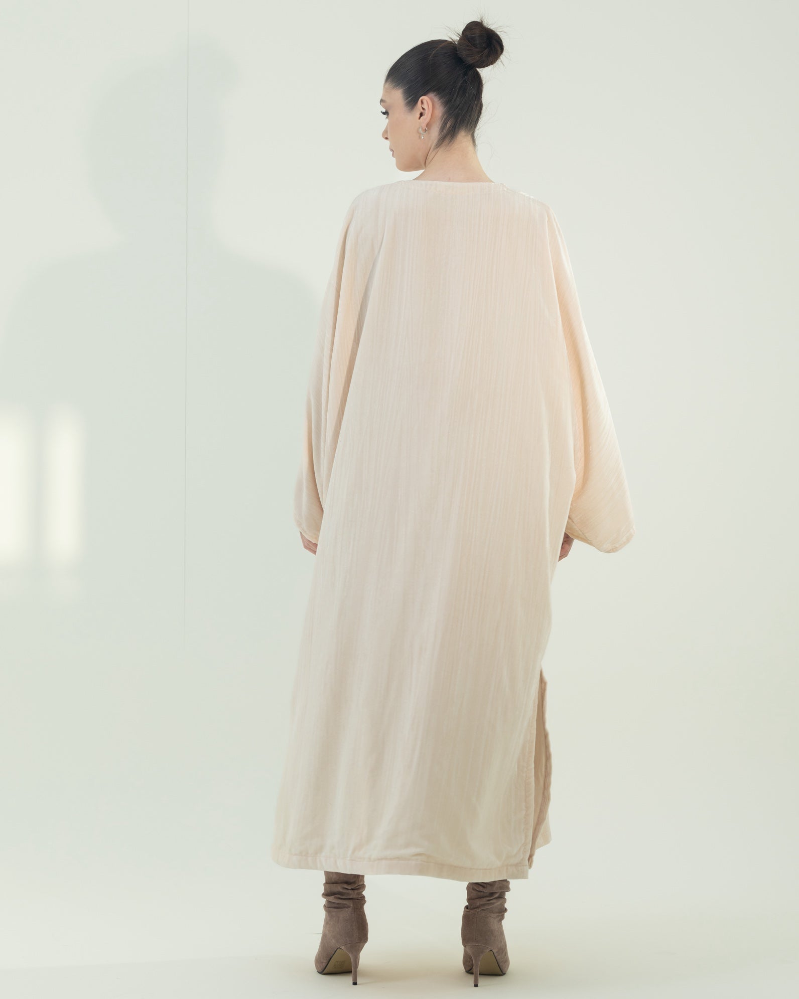 This piece is a flowing, free-size kaftan made from soft wrinkled velvet fabric. It features a relaxed silhouette with wide sleeves for an elegant drape and effortless comfort. The lightweight velvet texture gives it a subtle sheen and a graceful fall, making it perfect for both casual elegance and special occasions. Original length 56in.