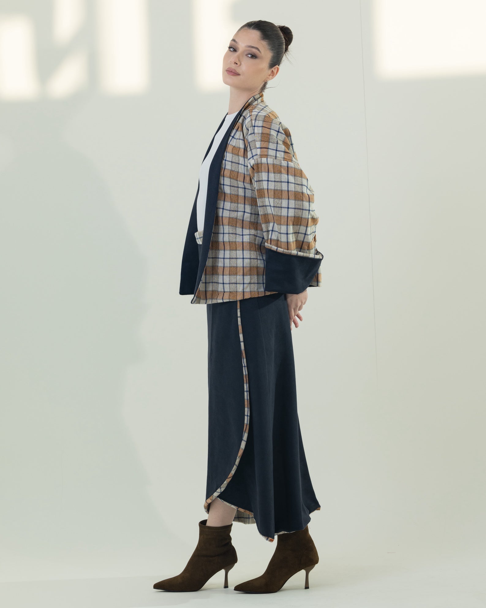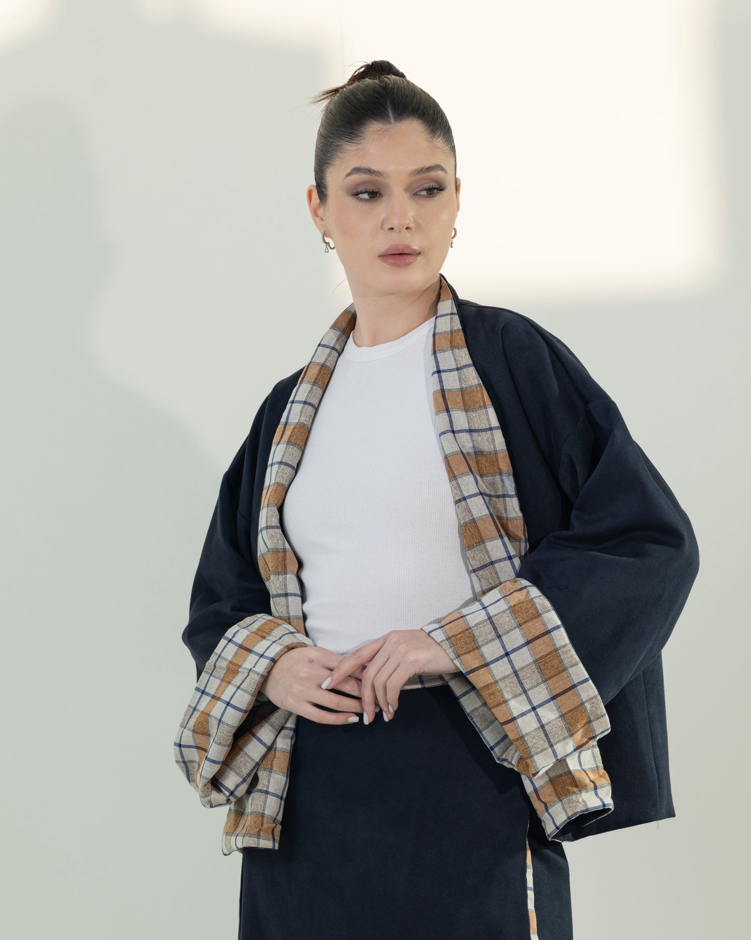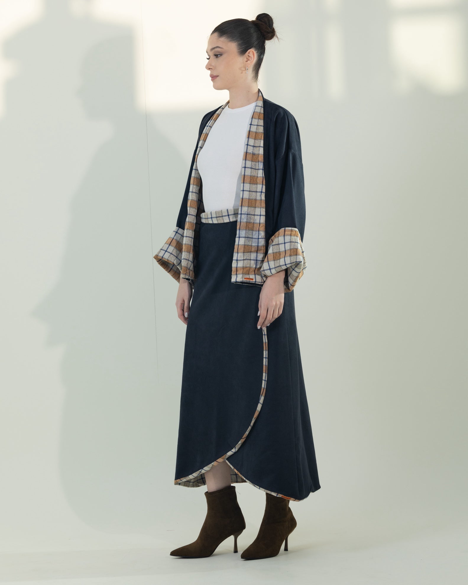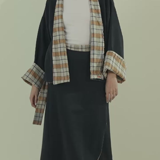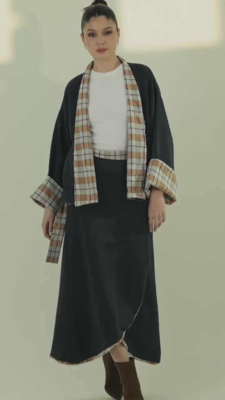 This modern suede two-piece set includes a chic wrap skirt and a statement kimono with checkered lining.The kimono is designed to be reversible, allowing you to wear it in two different ways for versatile styling. This set offers a perfect balance of elegance and contemporary design. The free-size silhouette provides a comfortable and flattering fit.