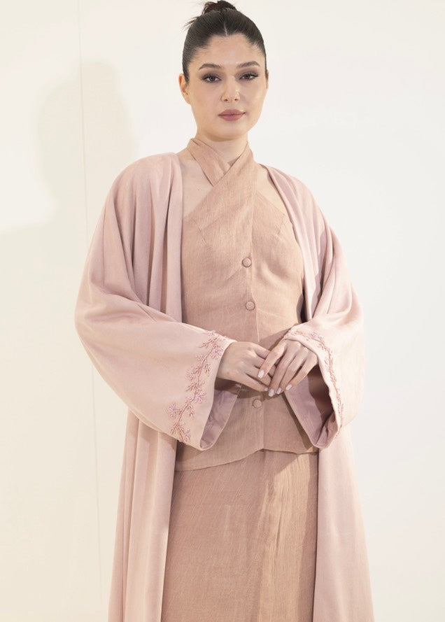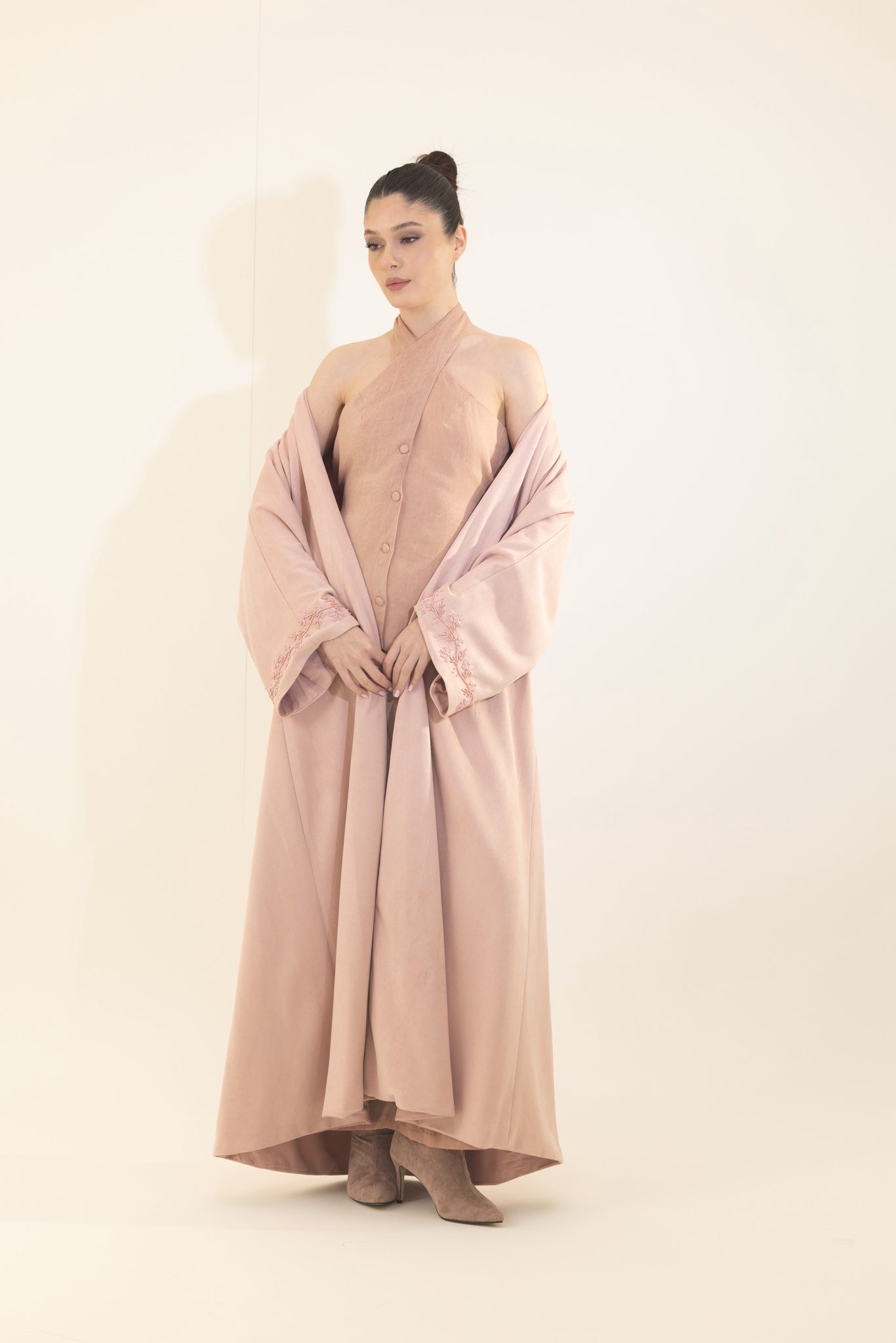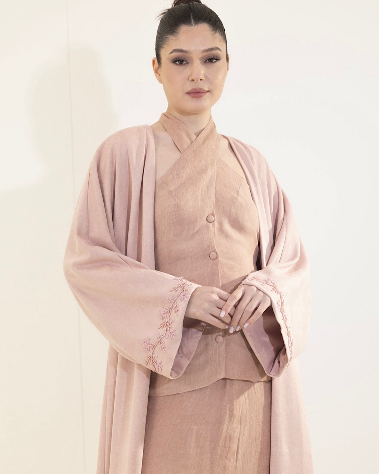 Pink linen skirt paired with a halter-neck, suit-cut inner top, designed with a side belt to create a more snatched waist. Styled with a matching pink suede bisht featuring floral embellishments on the sleeves. Original length is 54in and available in sizes S–M and M–L.