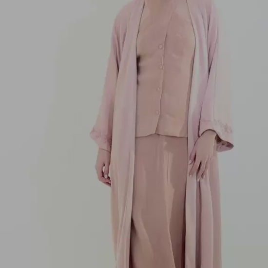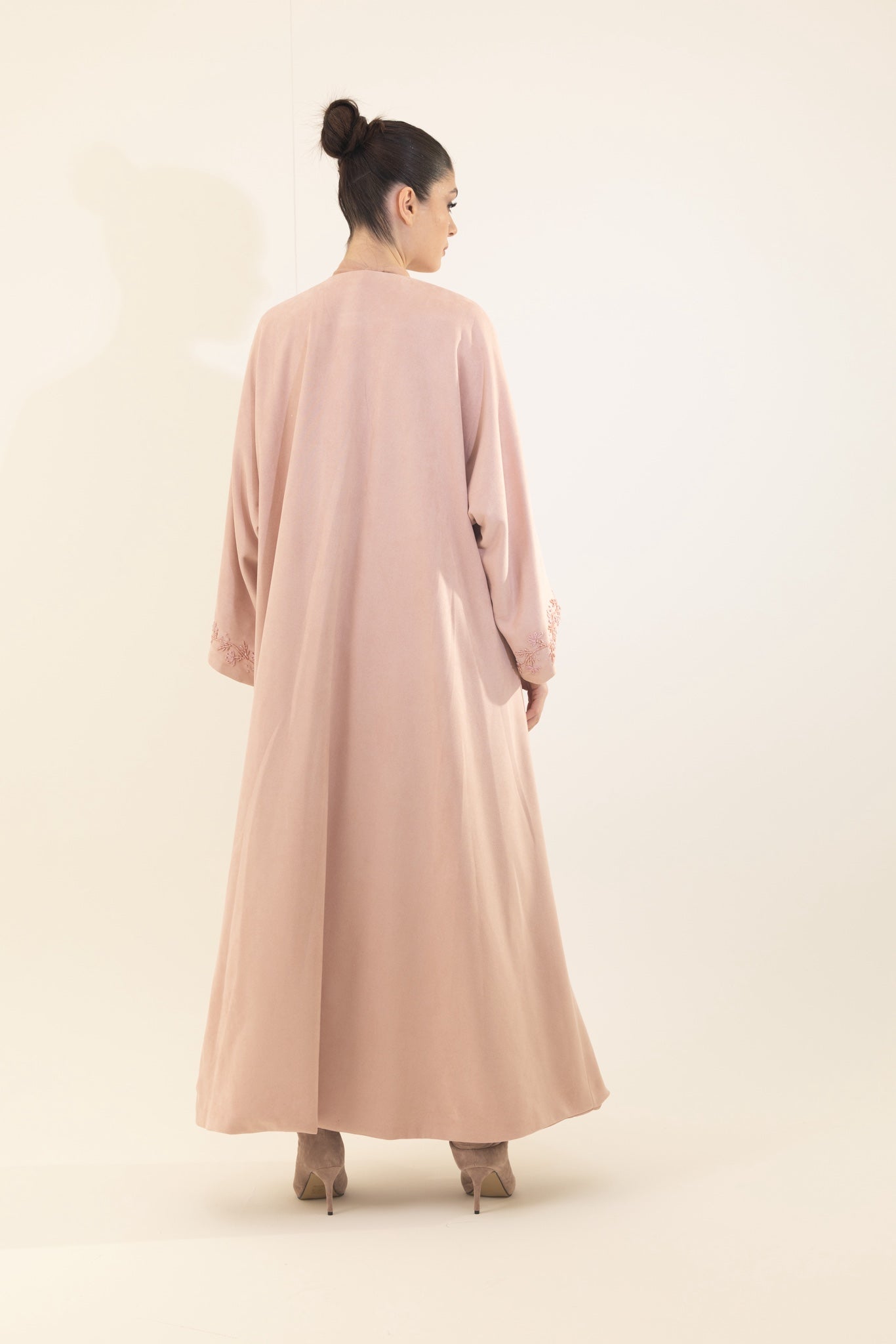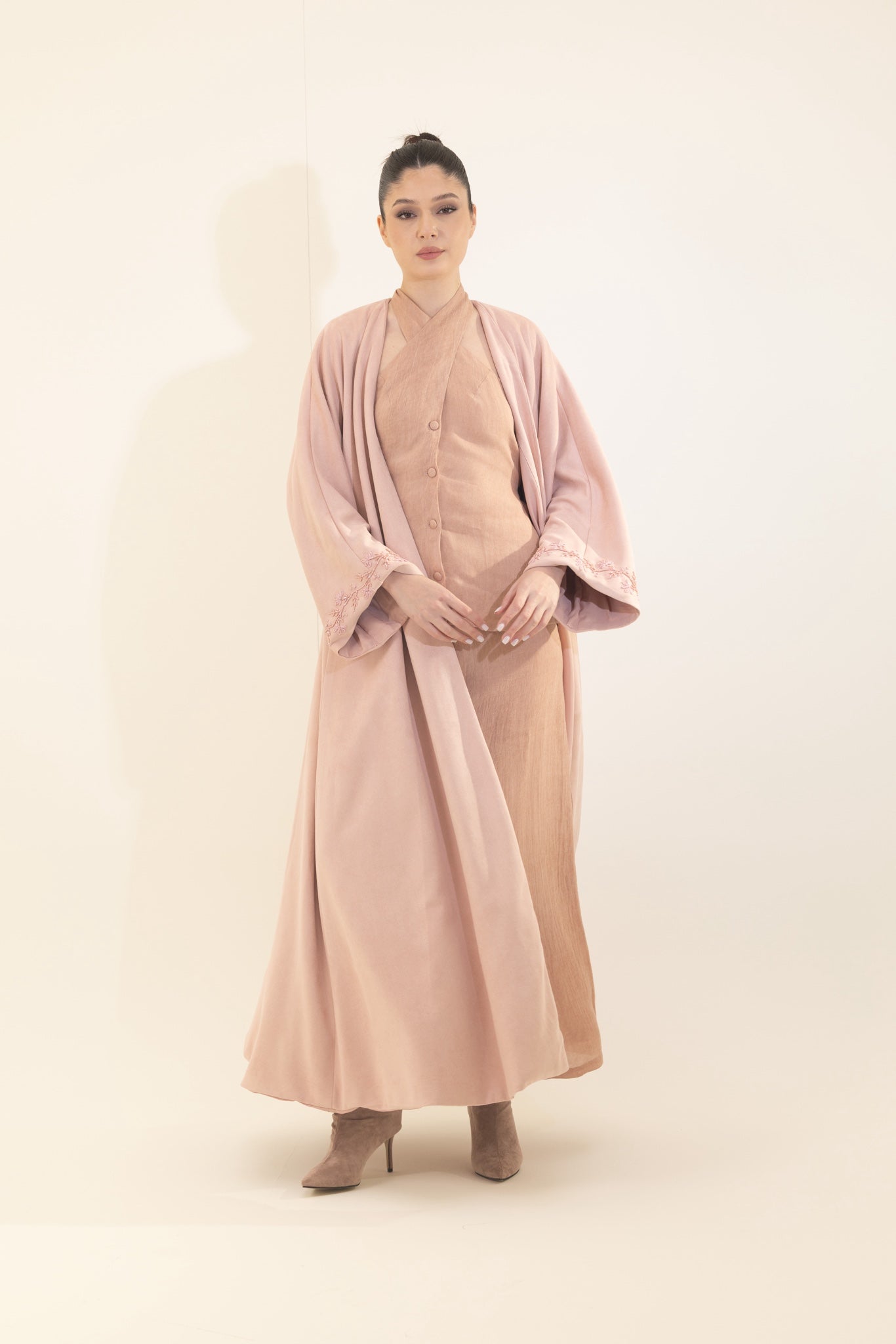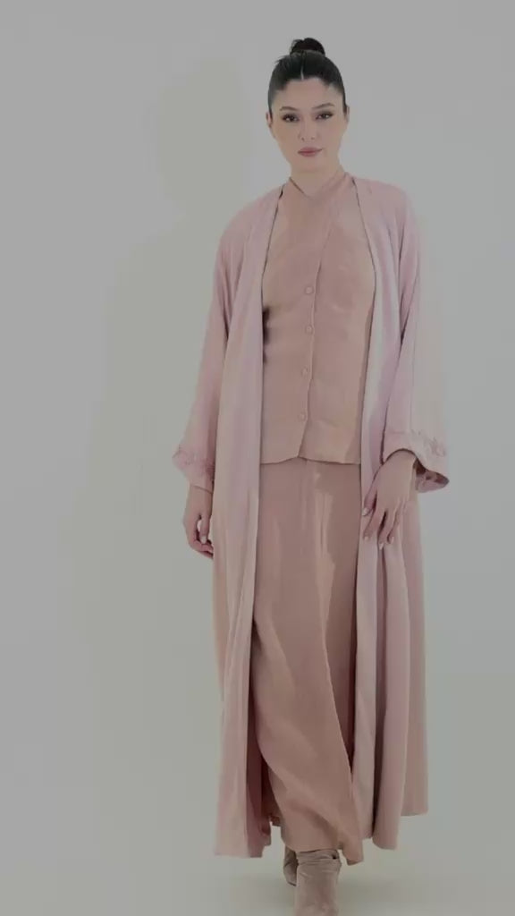 Pink linen skirt paired with a halter-neck, suit-cut inner top, designed with a side belt to create a more snatched waist. Styled with a matching pink suede bisht featuring floral embellishments on the sleeves. Original length is 54in and available in sizes S–M and M–L.