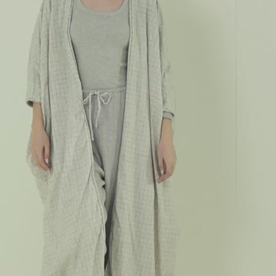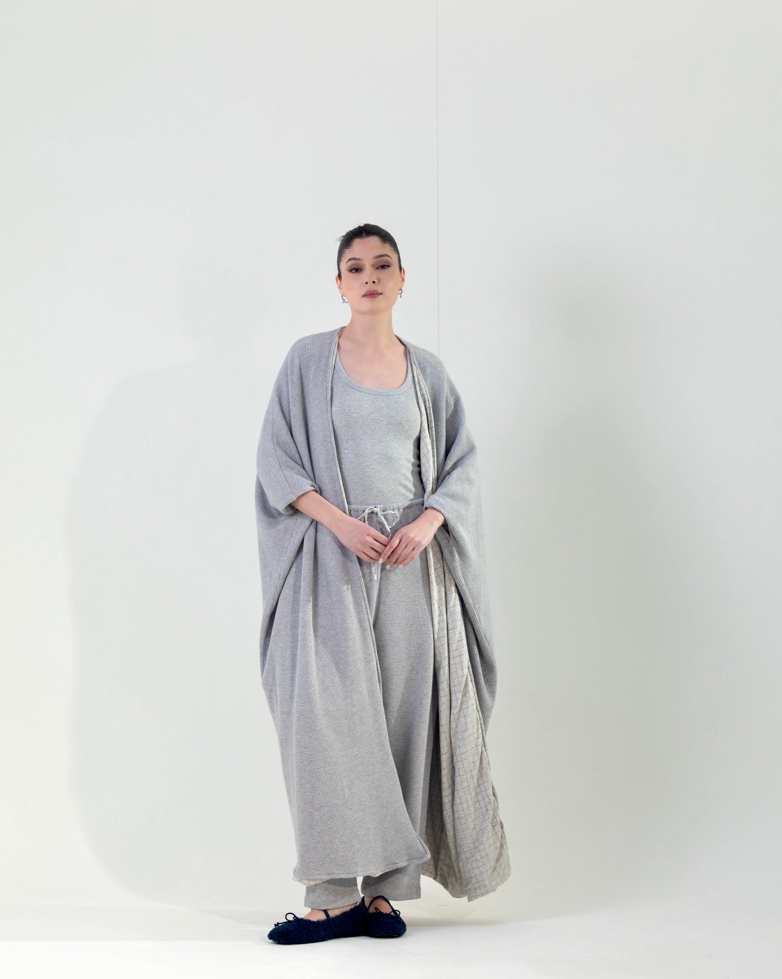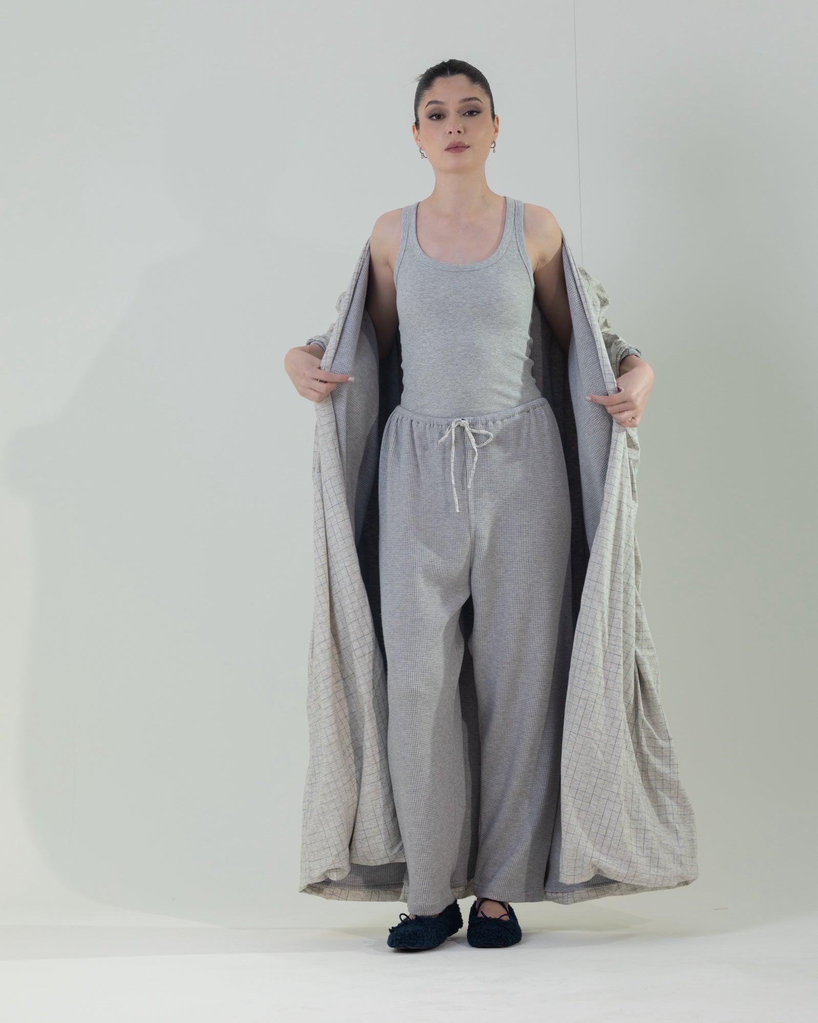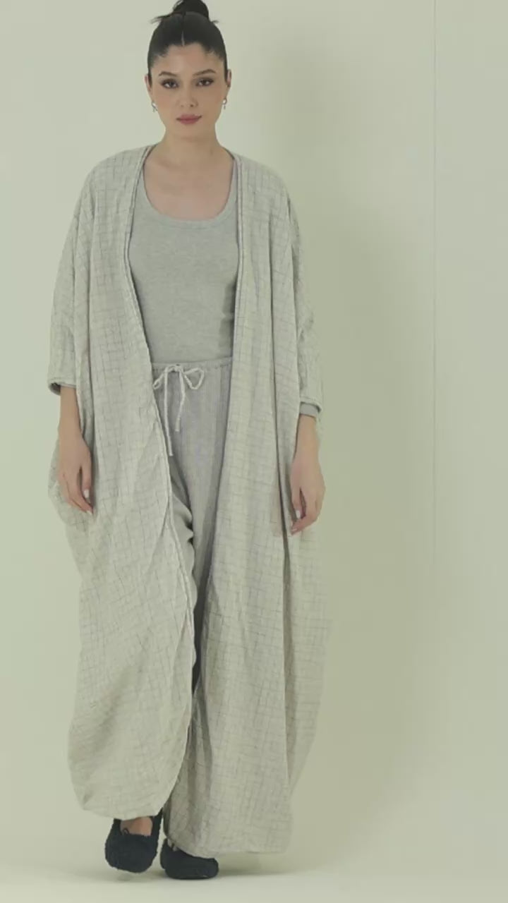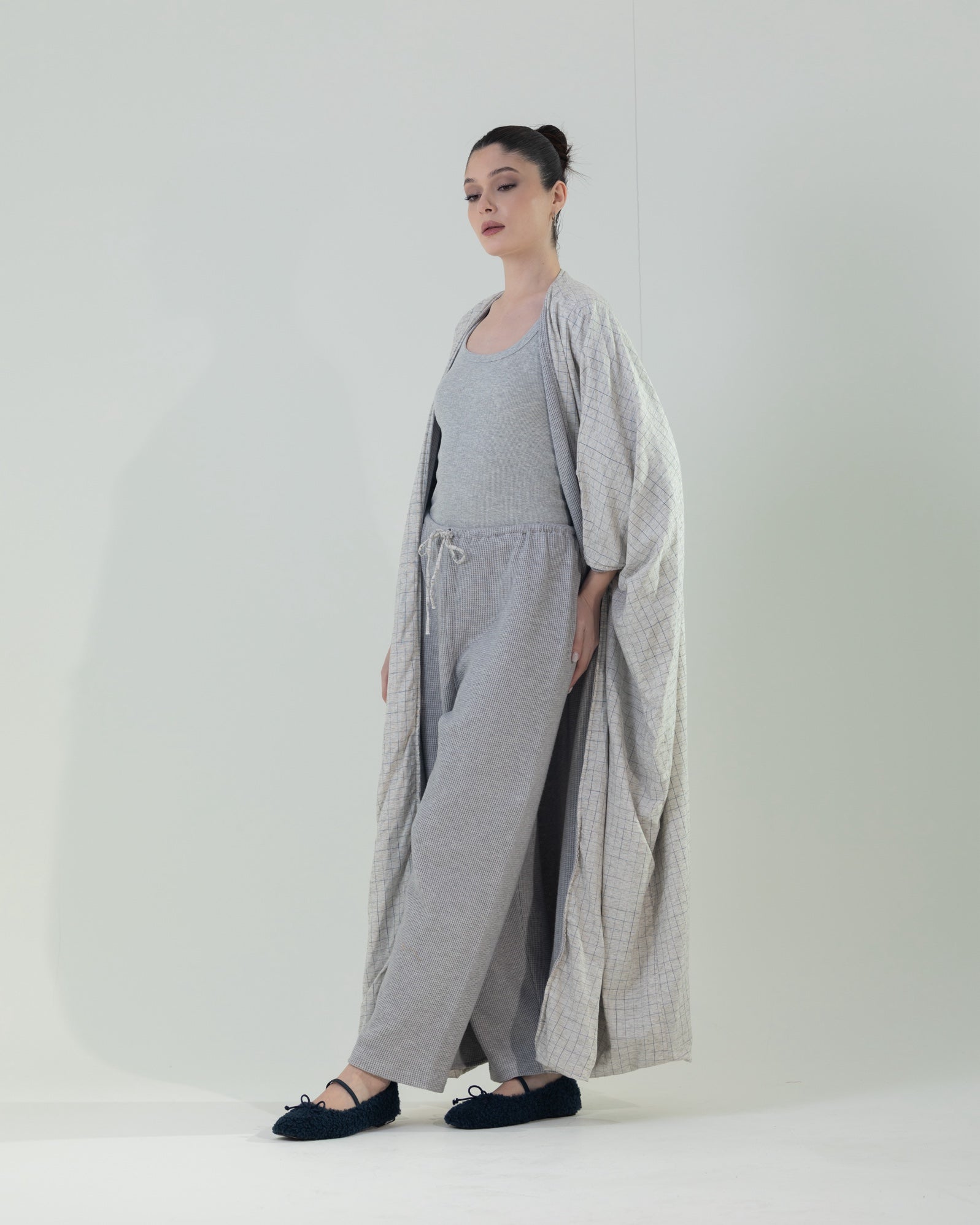 Stay comfortable and stylish this Ramadhan with our 2-piece free loungewear set. Featuring relaxed sweatpants and a reversible bisht with a navy checkered pattern, this set is designed for versatility and ease. The bisht has an adjustable 54-inch length, making it perfect for all body types. Ideal for lounging or casual gatherings, this set blends elegance with ultimate comfort.