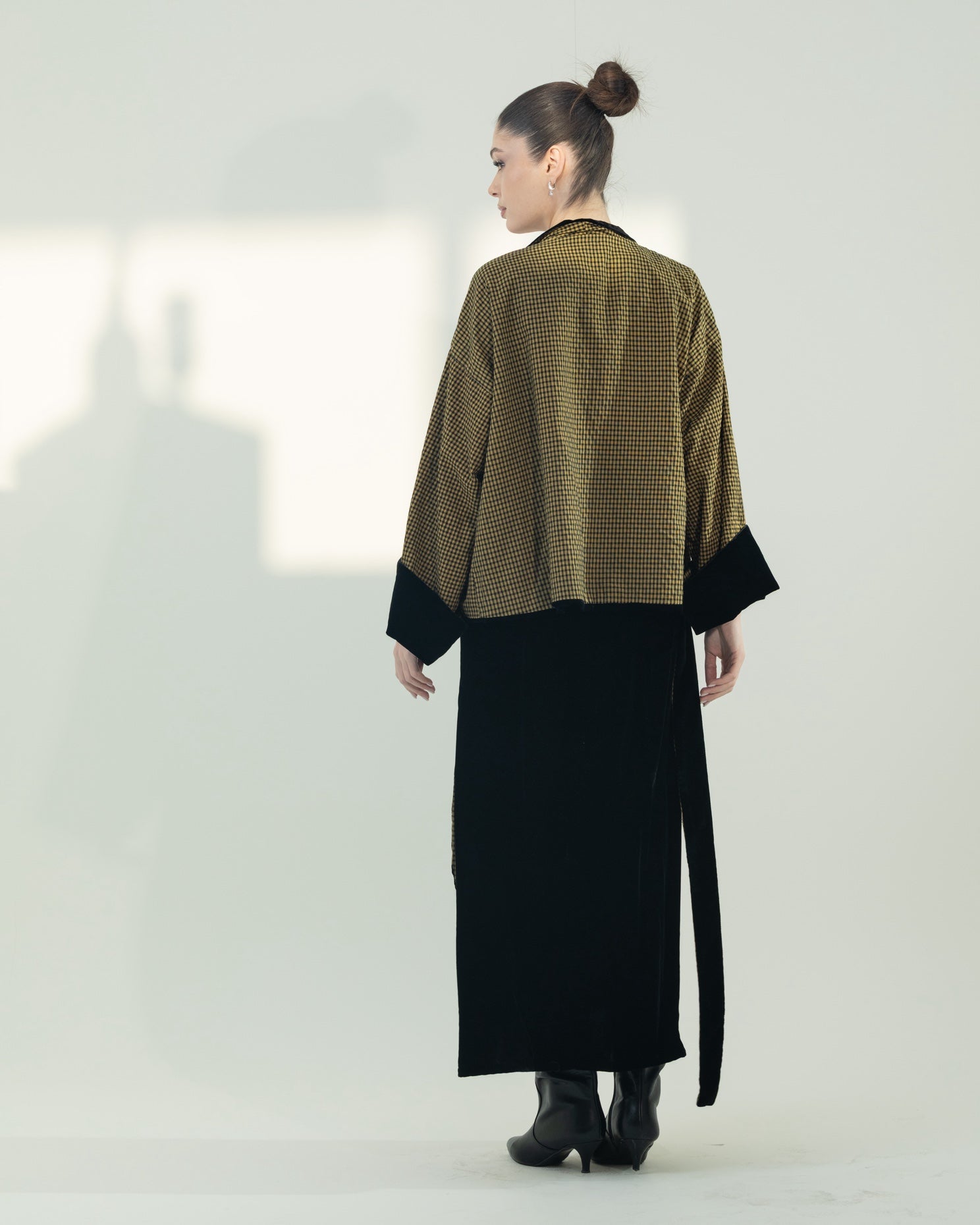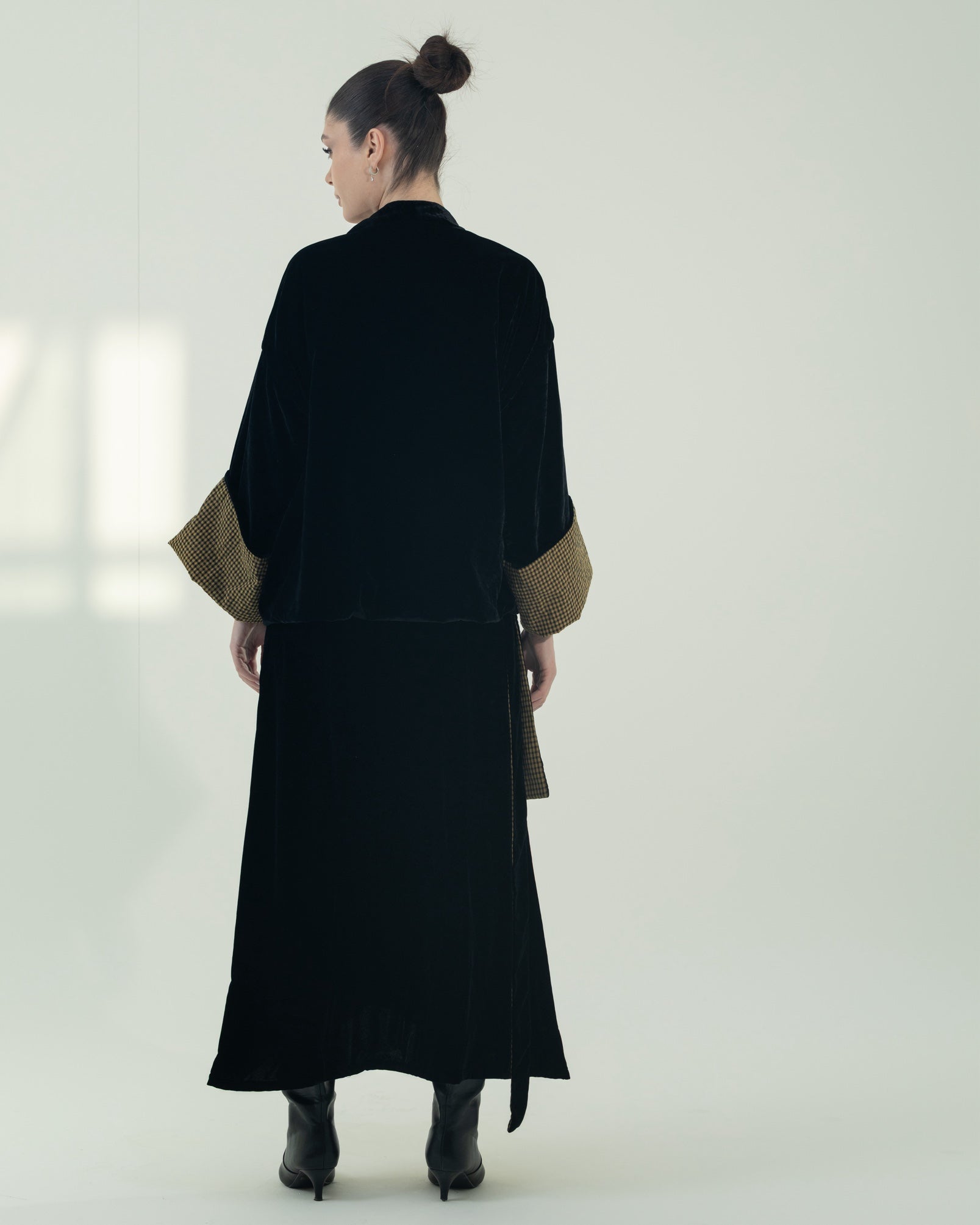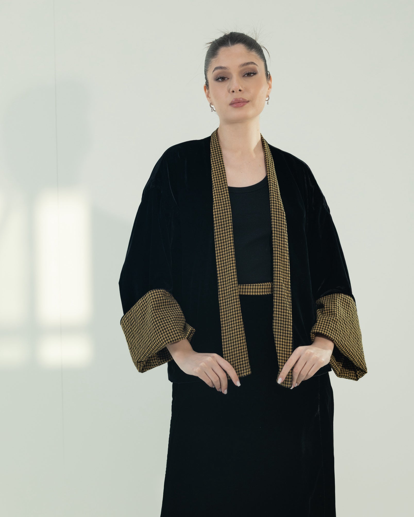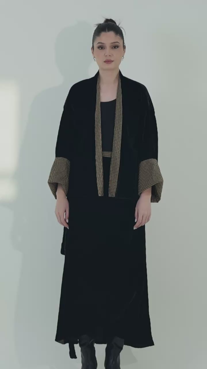This modern velvet two-piece set includes a chic wrap skirt and a statement kimono with checkered lining.The kimono is designed to be reversible, allowing you to wear it in two different ways for versatile styling. This set offers a perfect balance of elegance and contemporary design. The free-size silhouette provides a comfortable and flattering fit.